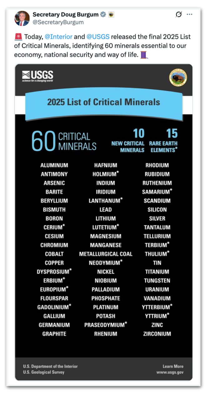 Doug Burgum, secretário do Interior, publicou a lista atualizada com 60 minerais críticos em seu perfil no X.