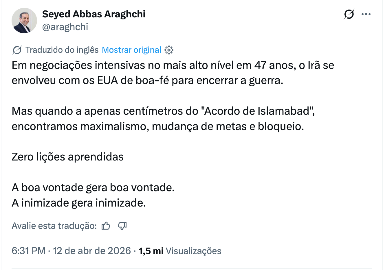 Neste domingo (12.abr.2026), o presidente dos EUA, Donald Trump (Partido Republicano), também afirmou em seu perfil no Truth Social que o estreito de Ormuz continua bloqueado pelos iranianos e exigiu a reabertura da rota marítima. Segundo Trump, o Irã se recusa a abandonar seu programa nuclear. “A reunião correu bem, a maioria dos pontos foi acordada, mas o único ponto que realmente importava, o programa nuclear, não foi”, escreveu o republicano.