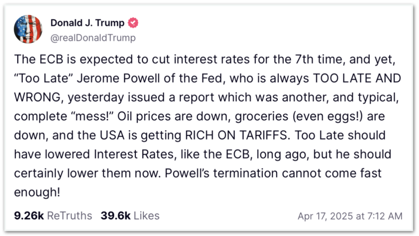 Powell disse na 4ª feira (16.abr.2025) que o Fed pode permanecer paciente e esperar para ver como as tarifas de Trump terão impacto na inflação norte-americana. Trump declarou que o Fed é “atrasado” e disse que Powell estava “errado” ao não reduzir as taxas de juros. Afirmou que os EUA estão enriquecendo com o tarifaço.