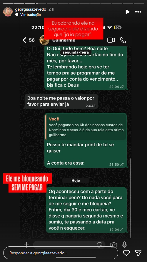 Segundo ela, a situação a levou a buscar outras formas de contato. Então, uma amiga mandou uma mensagem para o cantor, porém, ela também teria sido bloqueada: “Pagou uma das três dívidas e bloqueou o telefone da minha amiga também. Ainda faltavam R$ 15 mil. Ele pagou R$ 8,5 mil do cartão e bloqueou”, escreveu Georgia nos stories, junto a uma gravação da tela das supostas mensagens de Gui com a amiga.