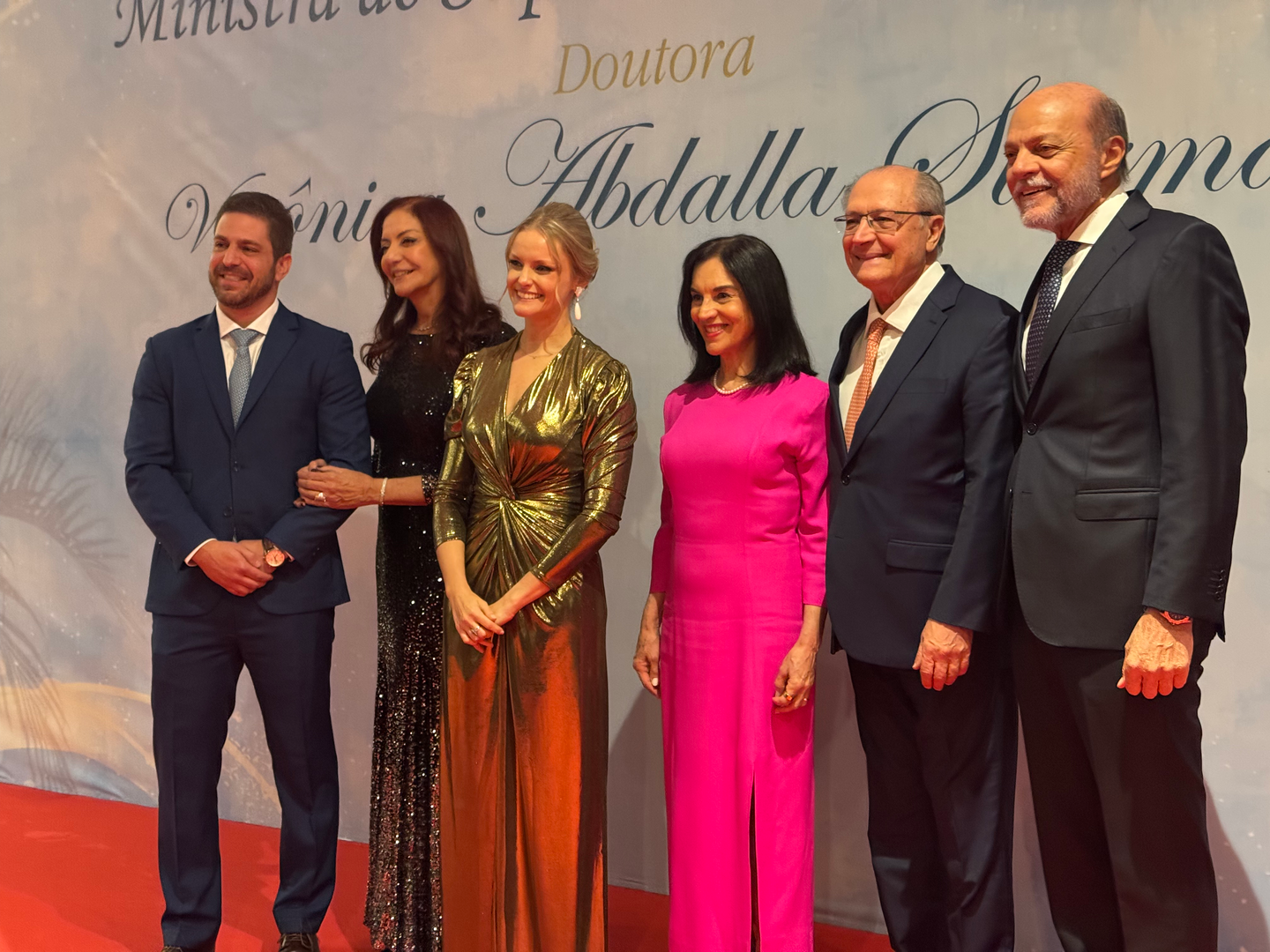 Verônica Sterman (de vestido dourado) com Lu Alckmin (de vestido rosa) e Geraldo Alckmin (de óculos)