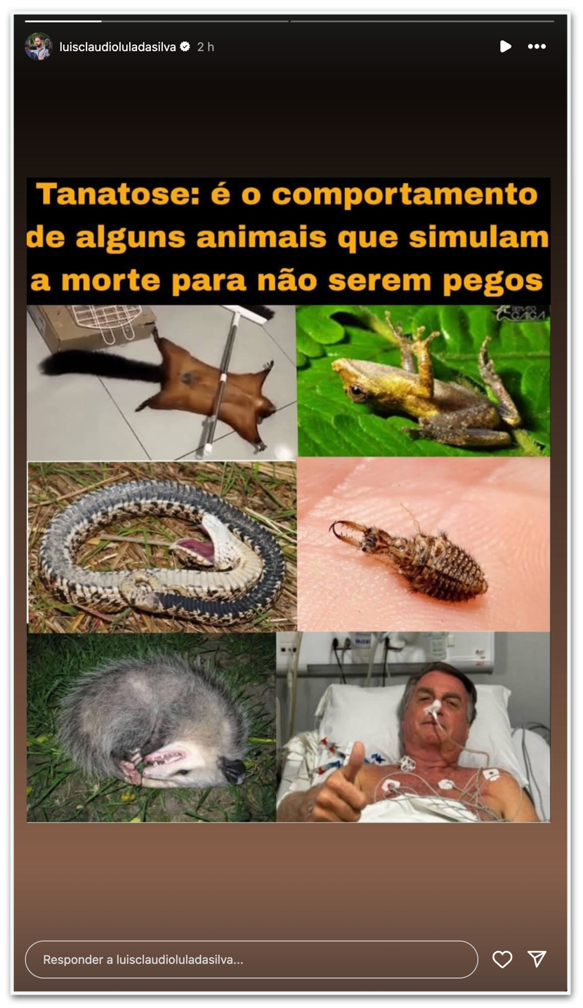 Luis Cláudio publicou uma explicação do que é a tanatose, comportamento de defesa no qual bichos simulam a morte para se proteger de predadores. Incluiu uma foto de Bolsonaro internado no hospital junto a imagens de animais como esquilo, sapo, gambá e cobra.