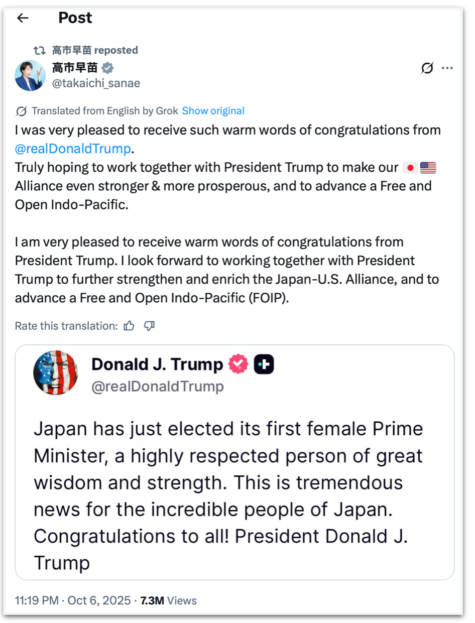 Em resposta no X (antigo Twitter), a parlamentar japonesa disse ter ficado “muito feliz em receber palavras tão calorosas de felicitações” de Trump. Takaichi afirmou “esperar verdadeiramente trabalhar junto com o presidente Trump para tornar a aliança ainda mais forte e próspera” entre os 2 países.