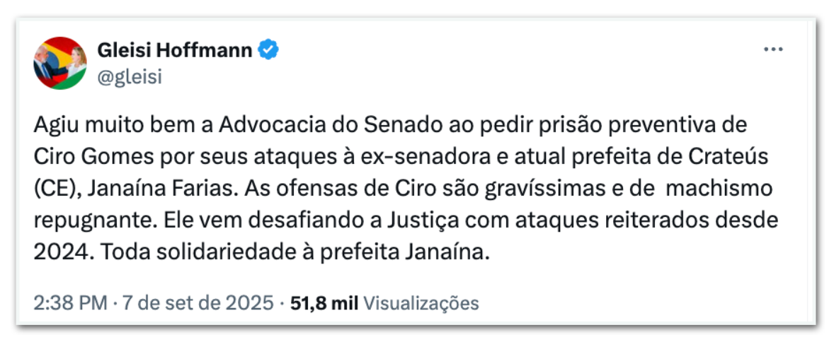 “Agiu muito bem a Advocacia do Senado ao pedir prisão preventiva de Ciro Gomes por seus ataques à ex-senadora e atual prefeita de Crateús (CE), Janaína Farias. As ofensas de Ciro são gravíssimas e de machismo repugnante. Ele vem desafiando a Justiça com ataques reiterados desde 2024. Toda solidariedade à prefeita Janaína”, escreveu Gleisi em seu perfil no X (antigo Twitter).