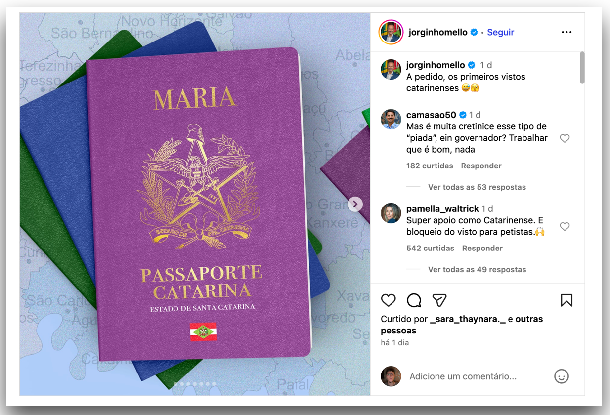 O governador de Santa Catarina, Jorginho Mello (PL), publicou no domingo (10.nov.2025) imagens do “passaporte catarina” em suas redes sociais, sugerindo em tom irônico que adotaria restrições para quem pretende se mudar para o Estado. Mello falou ainda em “pedir visto” para migrantes.