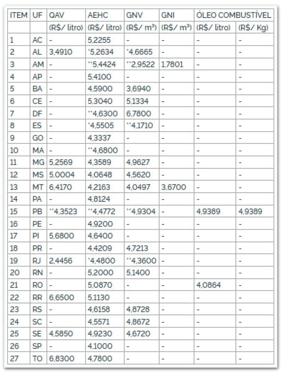 A tabela apresenta preços para os seguintes combustíveis: QAV (querosene de aviação), AEHC (álcool etílico hidratado combustível), GNV (gás natural veicular), GNI (gás natural industrial) e óleo combustível.