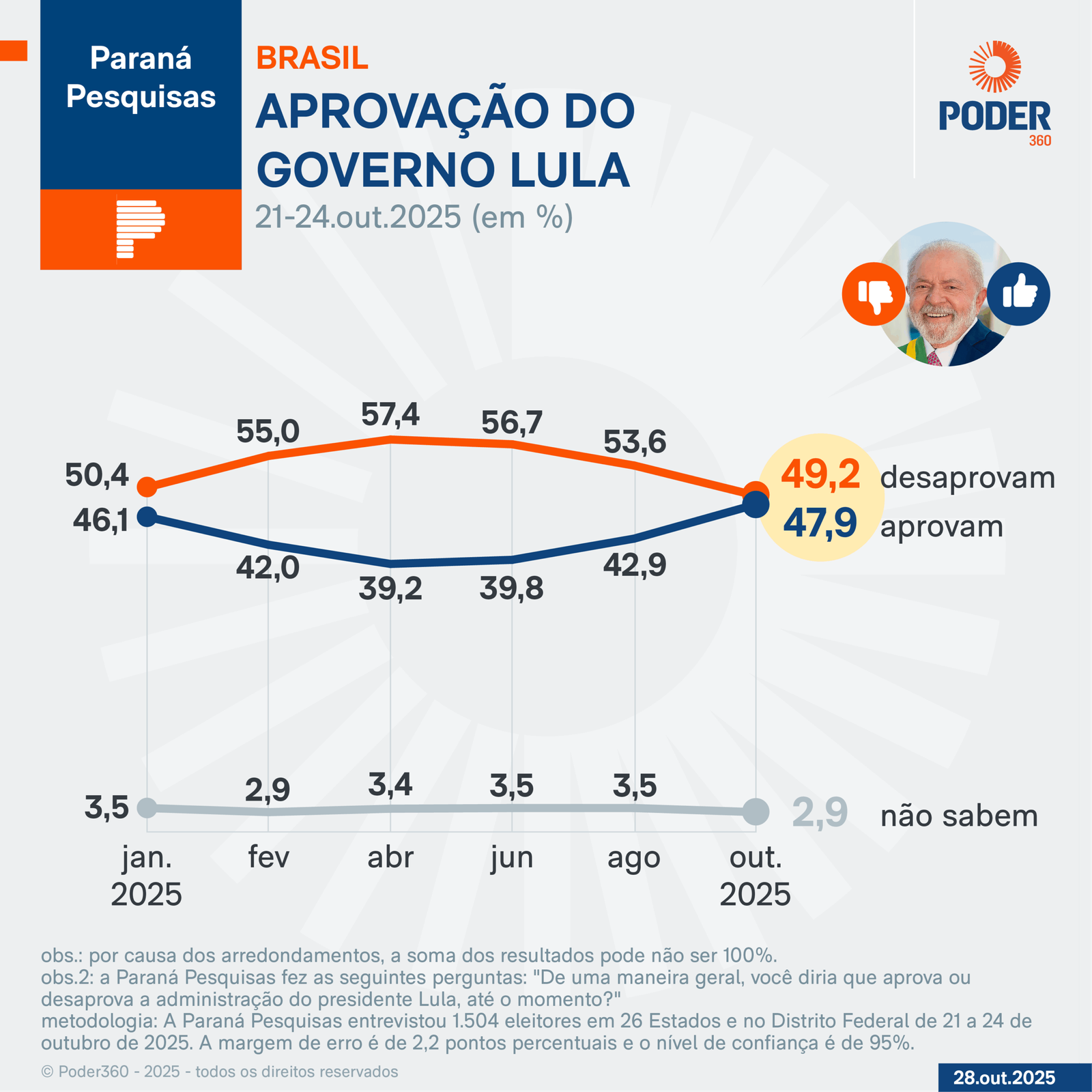Levantamento da Paraná Pesquisas divulgado nesta 3ª feira (28.out.2025) mostra que 49,2% dos eleitores dizem desaprovar o governo do presidente Luiz Inácio Lula da Silva (PT). A taxa caiu 4,4 pontos percentuais desde agosto, quando a pergunta foi feita pela última vez. Os que dizem aprovar somam 47,9%, alta de 5 pontos percentuais em 2 meses. Outros 2,9% não souberam opinar.
