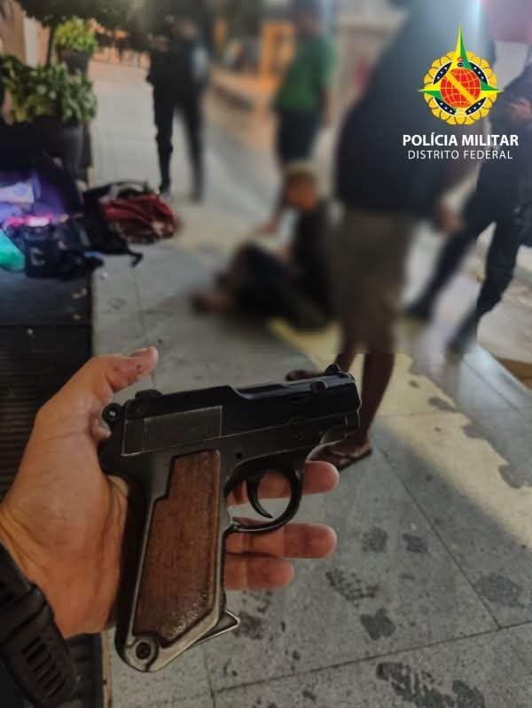 A equipe de policiais militares do GTOP 25 realizava patrulhamento tático na área comercial quando abordou dois homens. Durante a consulta aos sistemas, constatou-se que ambos possuíam extensa ficha criminal. Um dos indivíduos estava em posse de um simulacro de arma de fogo, objeto frequentemente utilizado para a prática de crimes de roubo.