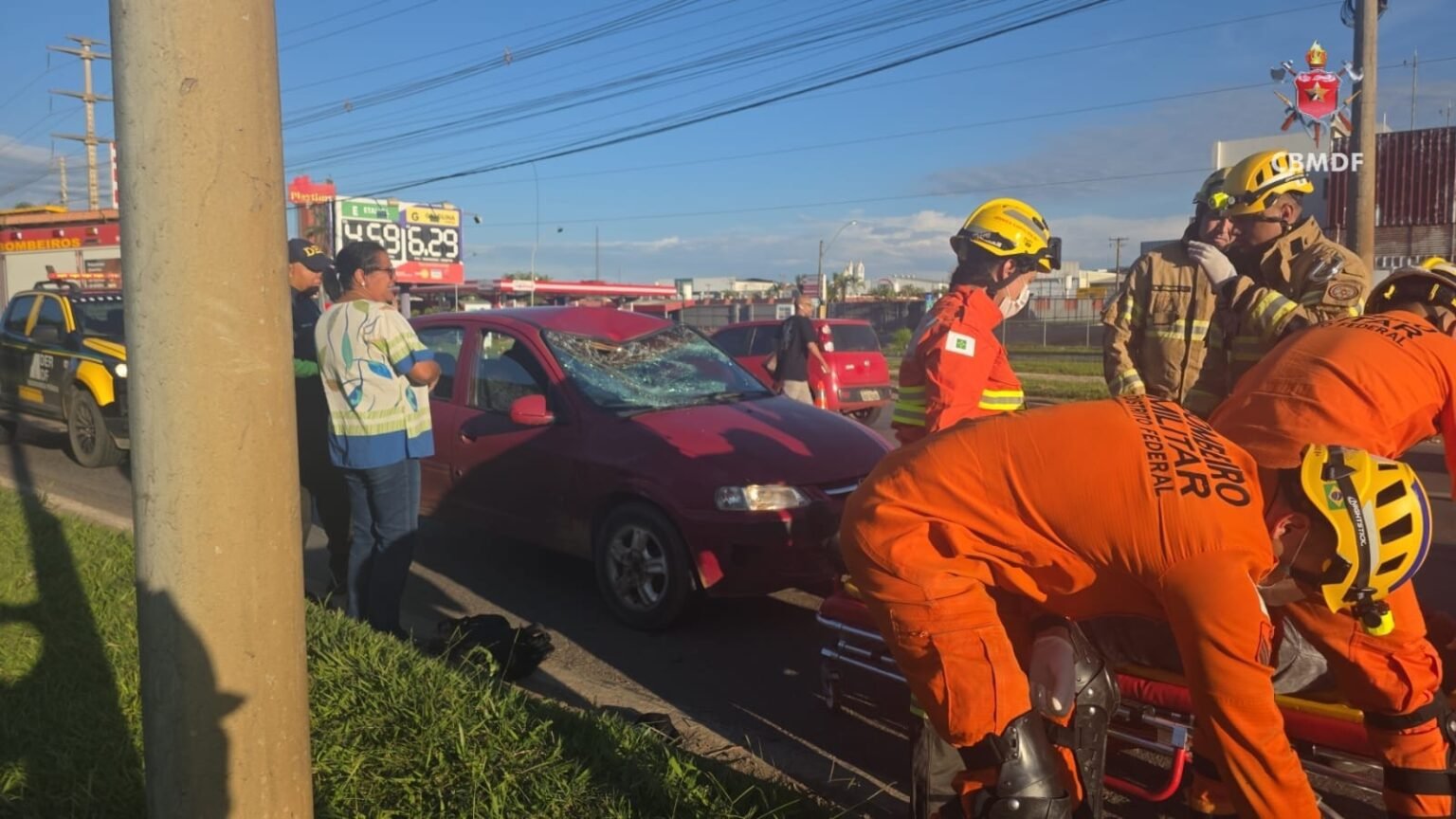 O Corpo de Bombeiros Militar do Distrito Federal (CBMDF) foi acionado e enviou duas viaturas para atender a ocorrência. No local, os socorristas encontraram um homem caído no chão, consciente e orientado, com escoriações pelo corpo, após ser atingido por um GM Corsa vermelho.