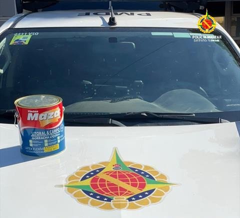 A equipe do 26º Batalhão se deslocou até o comércio indicado, onde a lata de tinta foi encontrada exposta para venda.