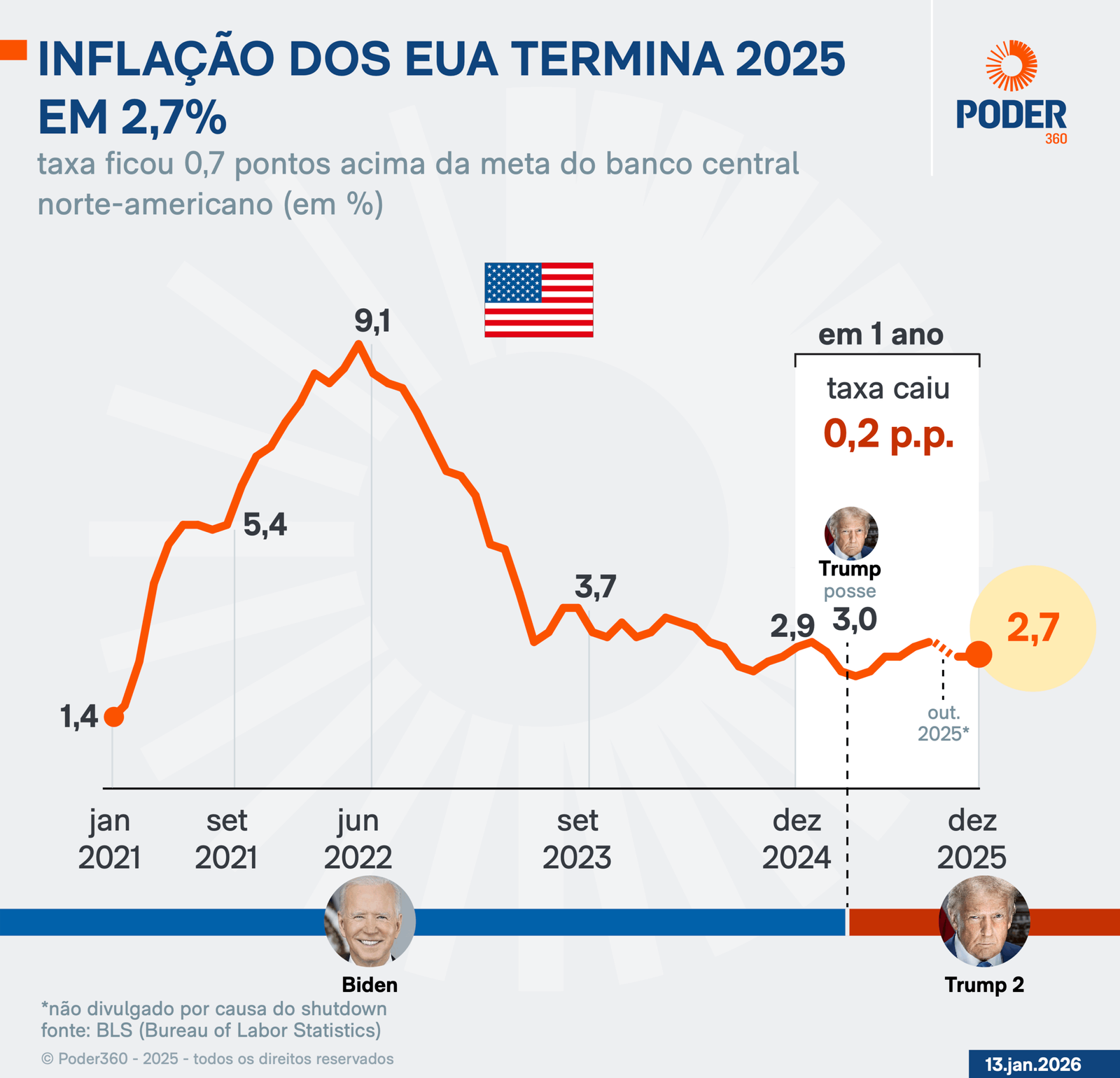 A inflação anualizada nos Estados Unidos terminou 2025 em 2,7%. É o mesmo número registrado em novembro, quando também foi de 2,7%. Os resultados foram divulgados nesta 3ª feira (13.jan.2026) pelo BLS (Bureau of Labor Statistics). Eis a íntegra do relatório (PDF – 489kB, em inglês).