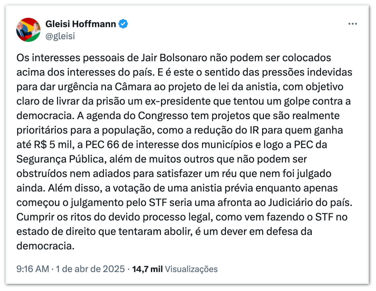 A ministra de Relações Institucionais, Gleisi Hoffmann, criticou nesta 3ª feira (1º.abr.2025) a decisão da oposição de pressionar o presidente da Câmara, deputado Hugo Motta (Republicanos-PB), para aprovar a urgência da análise do PL (projeto de lei) que propõe anistia aos envolvidos no 8 de Janeiro.