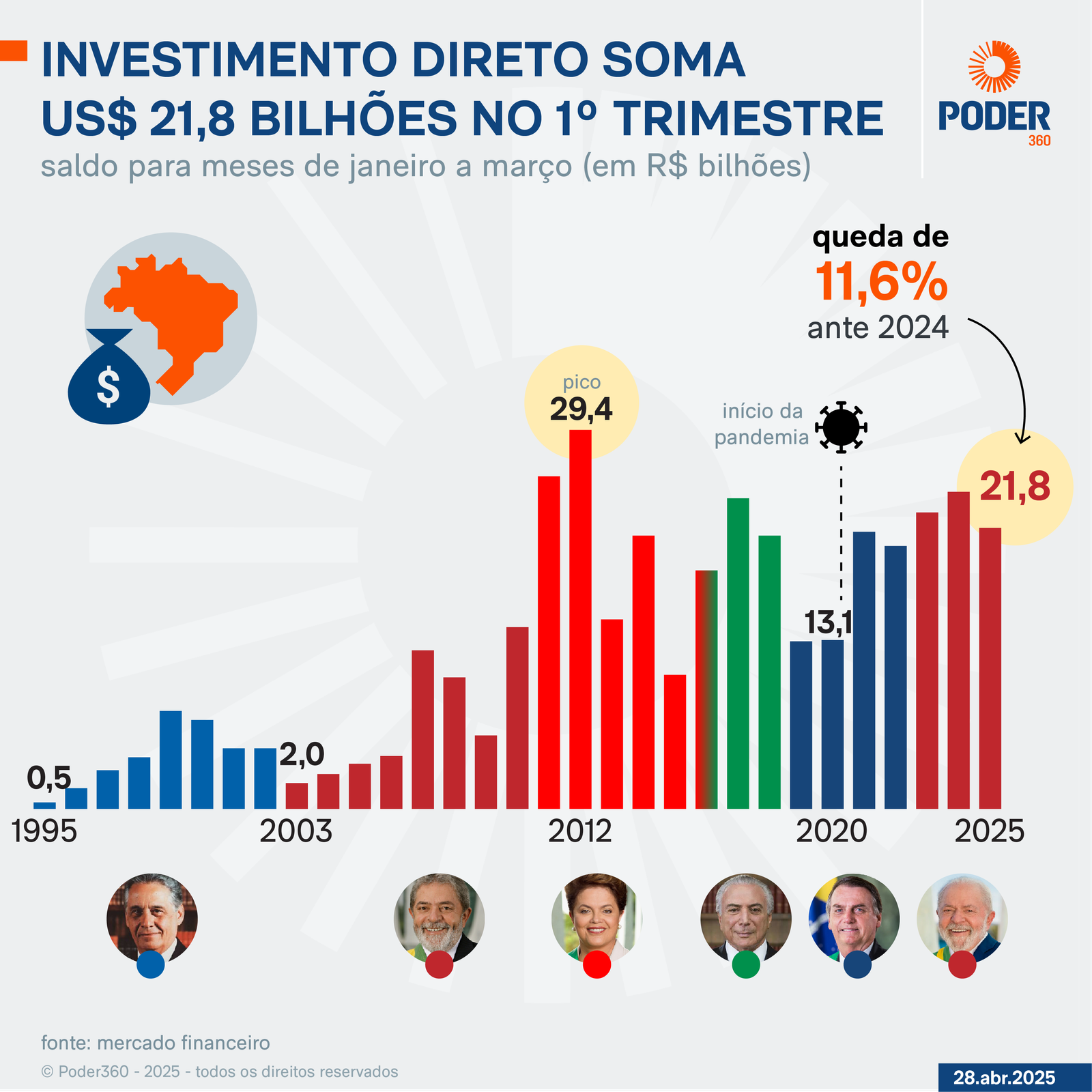 O saldo do IDP (Investimento Direto no País) somou US$ 21,8 bilhões no 1º trimestre de 2025. O valor representa uma queda de 11,59% em relação ao mesmo período do ano passado, quando totalizou US$ 24,6 bilhões.