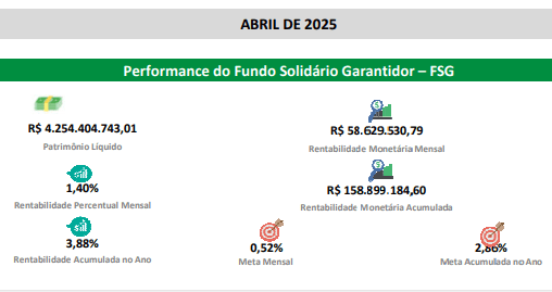 O Fundo Solidário Garantidor (FSG), principal fundo administrado pelo Iprev-DF, teve rentabilidade de 1,40% em abril, acumulando 3,88% no primeiro quadrimestre do ano. O índice superou tanto a meta de 2,86% quanto o IPCA do período (2,48%). Com essa performance, o fundo registrou ganhos nominais de R$ 158,9 milhões e alcançou R$ 4,25 bilhões em investimentos financeiros.