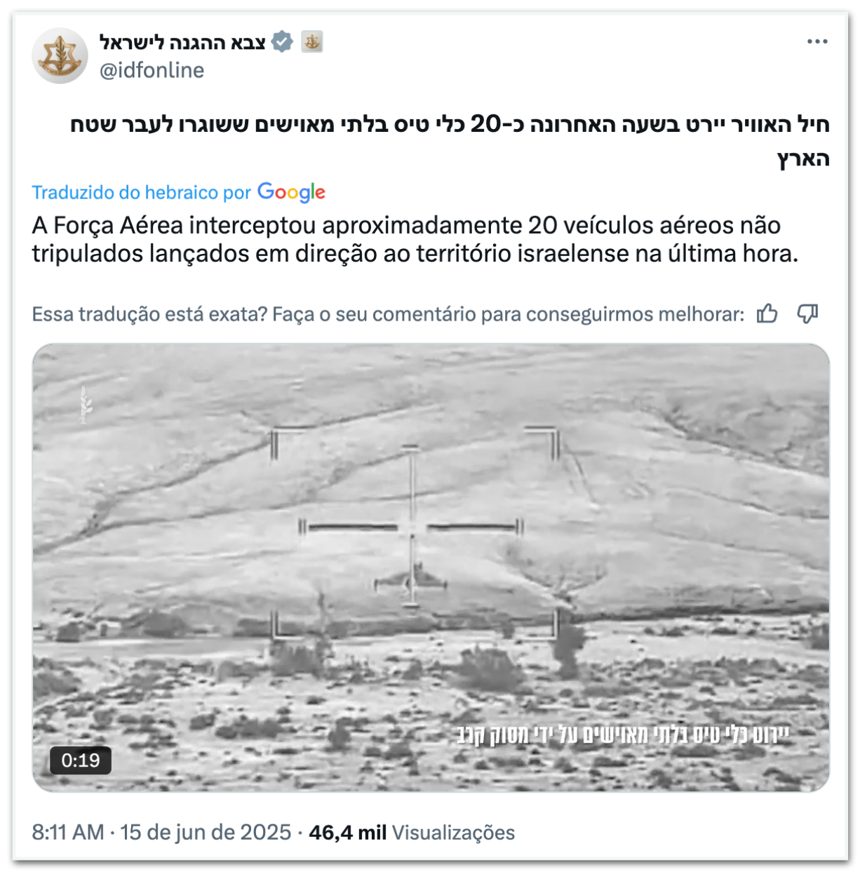 As Forças de Defesa de Israel (IDF, na sigla em inglês) informaram neste domingo (15.jun.2025) que interceptaram cerca de 20 drones lançados pelo Irã. Segundo o Exército israelense, o Irã também disparou “centenas de mísseis balísticos” contra o território israelense, no 4º dia de confronto direto entre os dois países.