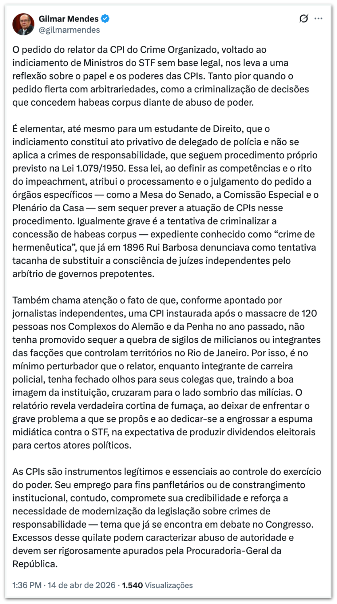 “Em ano eleitoral, esse cuidado deve ser ainda maior. Temas de forte apelo social exigem responsabilidade, avaliação de impactos e visão de longo prazo, para evitar decisões precipitadas e efeitos negativos sobre a economia. Por isso, a CNI pede a atenção de Vossa Excelência ao manifesto e solicita que a matéria não seja deliberada sem que sejam levadas em conta a realidade econômica do Brasil e as necessidades concretas das empresas que atuam em seu estado.