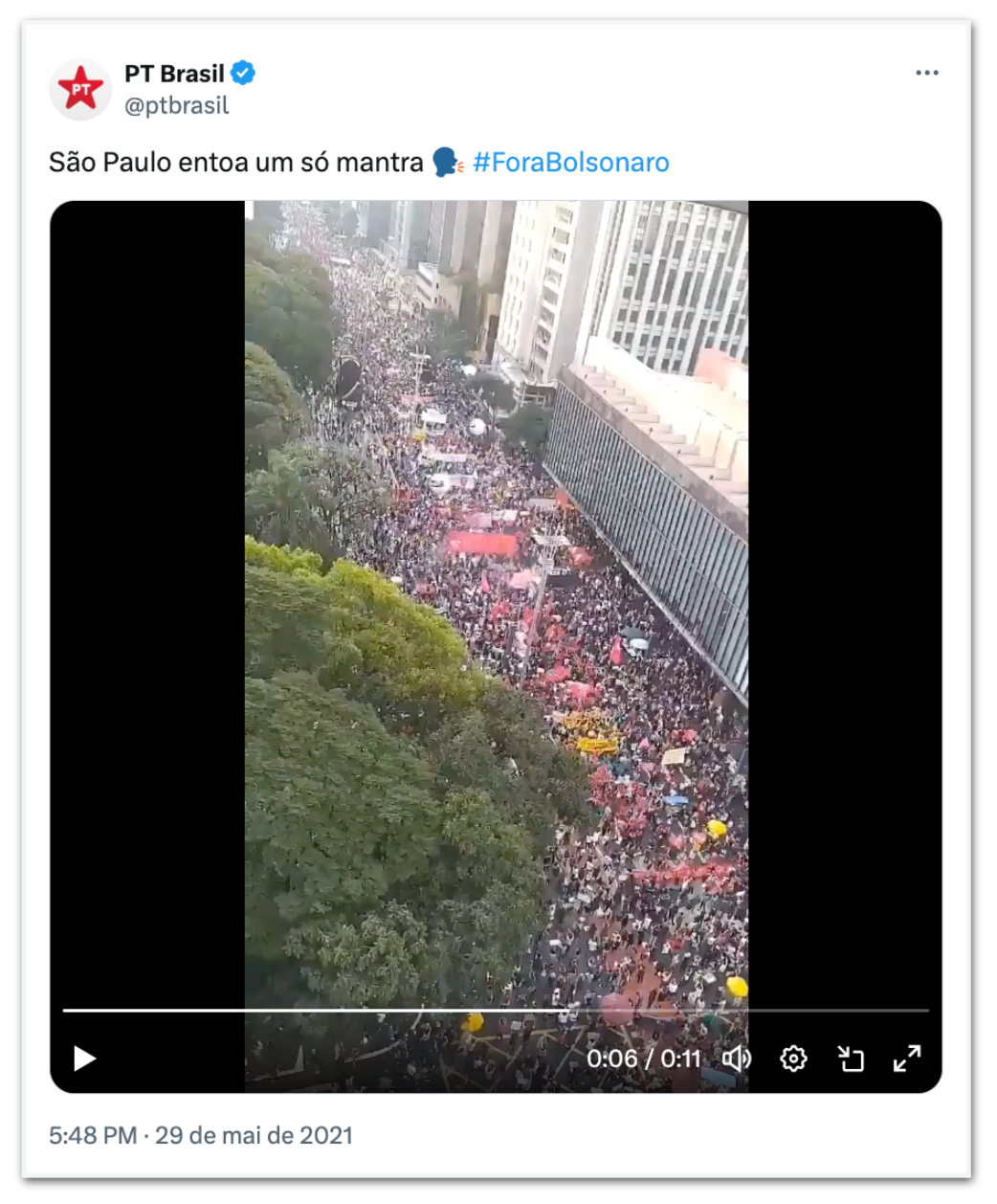 José Guimarães publicou imagens de uma manifestação de 2021 contra Bolsonaro; psolista reuniu cerca de 5.500 em SP