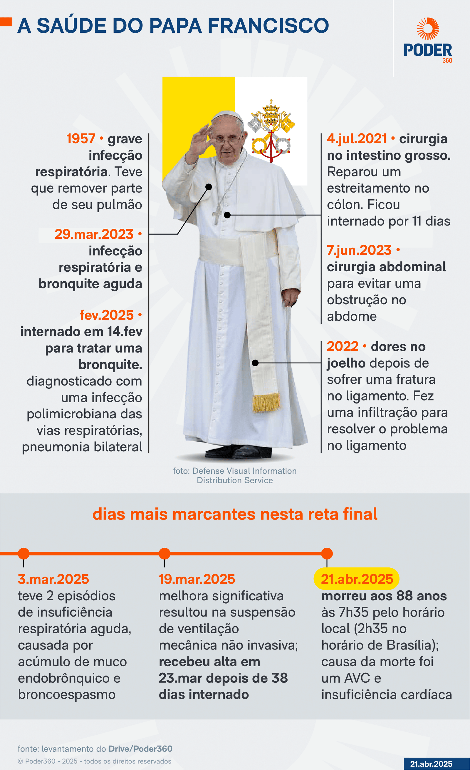 Em 22 de fevereiro, o Vaticano afirmou que Francisco enfrentou uma crise prolongada de asma e precisou passar por uma transfusão de sangue e que ele “não estava fora de perigo”. Os exames realizados mostraram plaquetopenia (diminuição do número de plaquetas no sangue) associada à anemia, o que levou à necessidade da transfusão. O religioso teve alta em 23 de março e estava em recuperação. Sua última aparição pública foi no domingo (20.abr), na bênção de Páscoa.