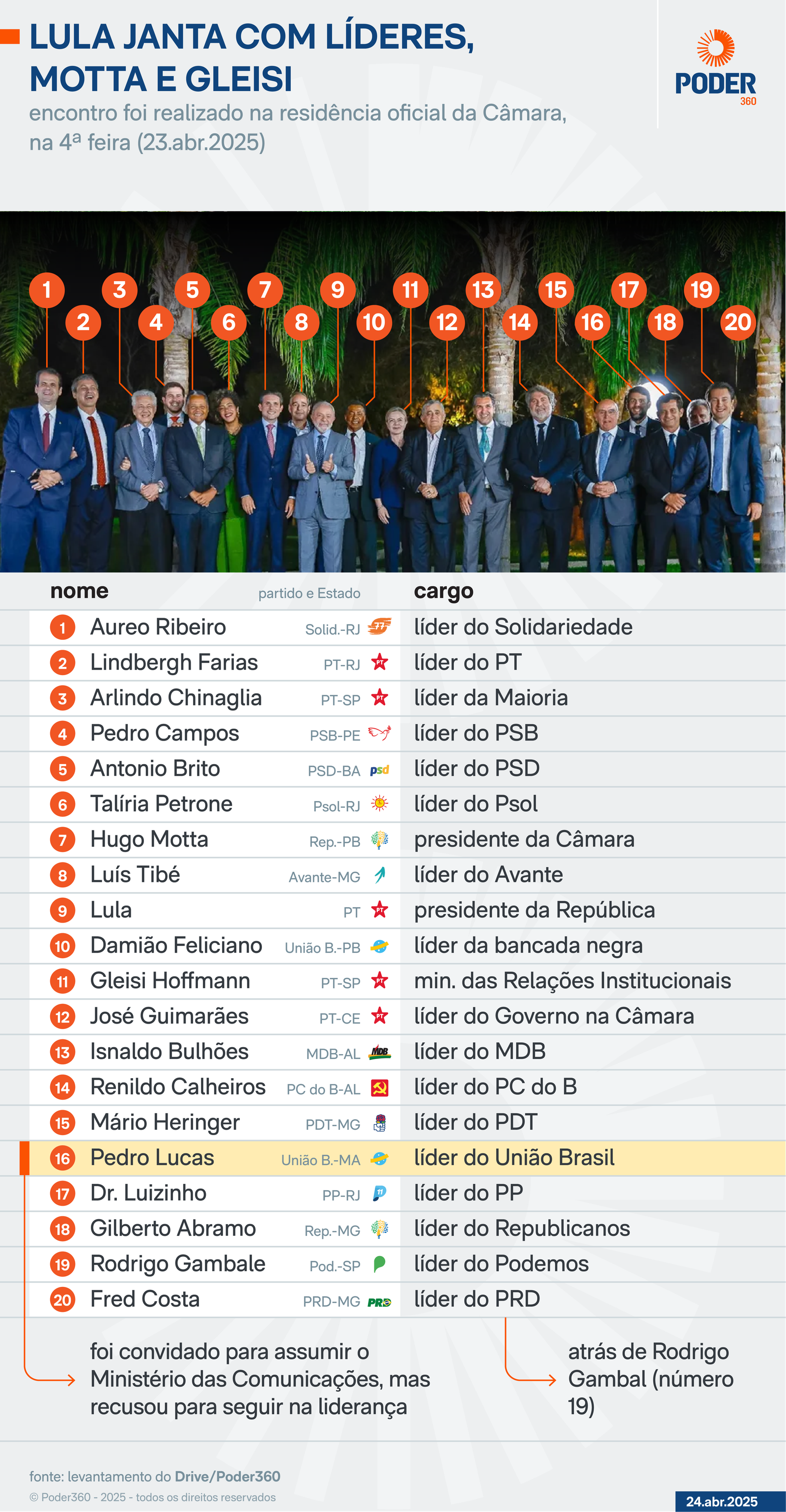 O jantar com Motta e os líderes teve tom informal e descontraído. O líder do União Brasil na Câmara, Pedro Lucas Fernandes (MA), afirmou que a interação com Lula foi “agradável”.