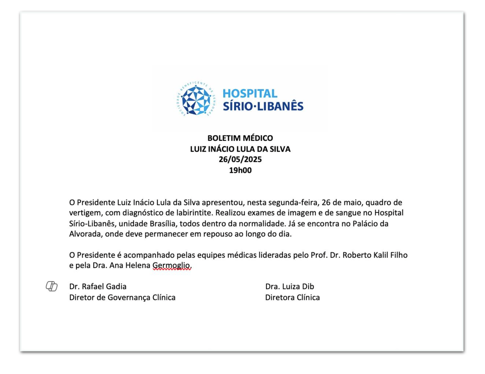 O presidente Luiz Inácio Lula da Silva (PT), 79 anos, teve uma vertigem na tarde desta 2ª feira (26.mai.2025) e foi encaminhado para o hospital Sírio-Libanês de Brasília. Ele foi diagnosticado um quadro de labirintite. O petista realizou exames de sangue e de imagem.