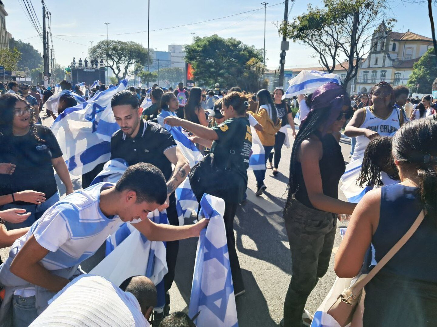 As menções ao Estado judeu dominam o evento, das bandeiras distribuídas entre os fiéis às manifestações de autoridades e religiosos no palco. O governador paulista, Tarcísio de Freitas (Republicanos), abriu a marcha com uma bandeira de Israel nas costas.