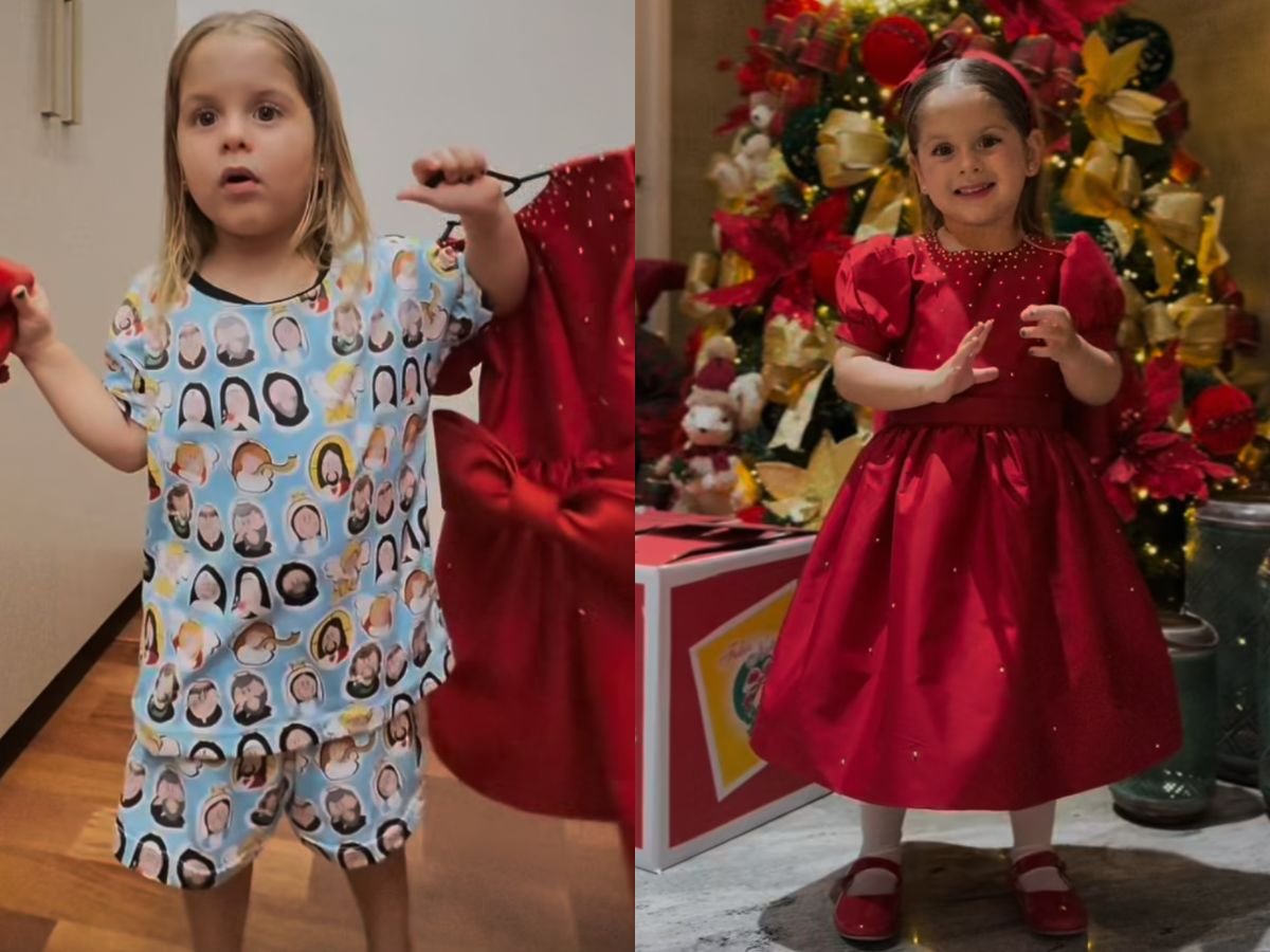 No vídeo compartilhado nos stories de Zé, Maria Flor apareceu dentro de um closet, de pijaminha, já animada para o Natal. A pequena segurava a roupa escolhida para a data, um vestido vermelho acompanhado de um sapatinho combinando, e, com toda a fofura, declarou: “Arrume-se comigo para o Natal”, mostrando que queria participar da trend.