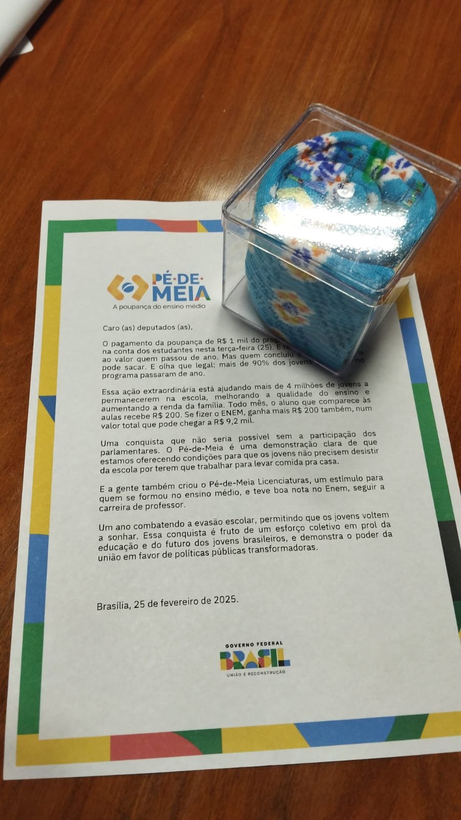 O programa é uma das principais bandeiras do governo Lula 3, que enfrenta desde o início de 2025 problemas em sua popularidade. As meias foram enviadas dentro de caixas de acrílico acompanhadas de uma carta com elogios ao programa e a mensagem de que se tratava de uma “conquista” que “não seria possível sem a participação” dos congressistas.