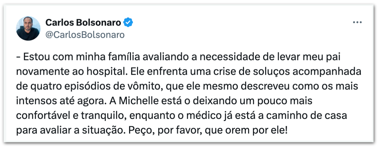 Horas antes, o vereador Carlos Bolsonaro (PL-RJ) havia afirmado no seu perfil no X que a família avaliava levar o ex-presidente ao hospital em razão de uma crise de soluços “acompanhada de 4 episódios de vômito”.