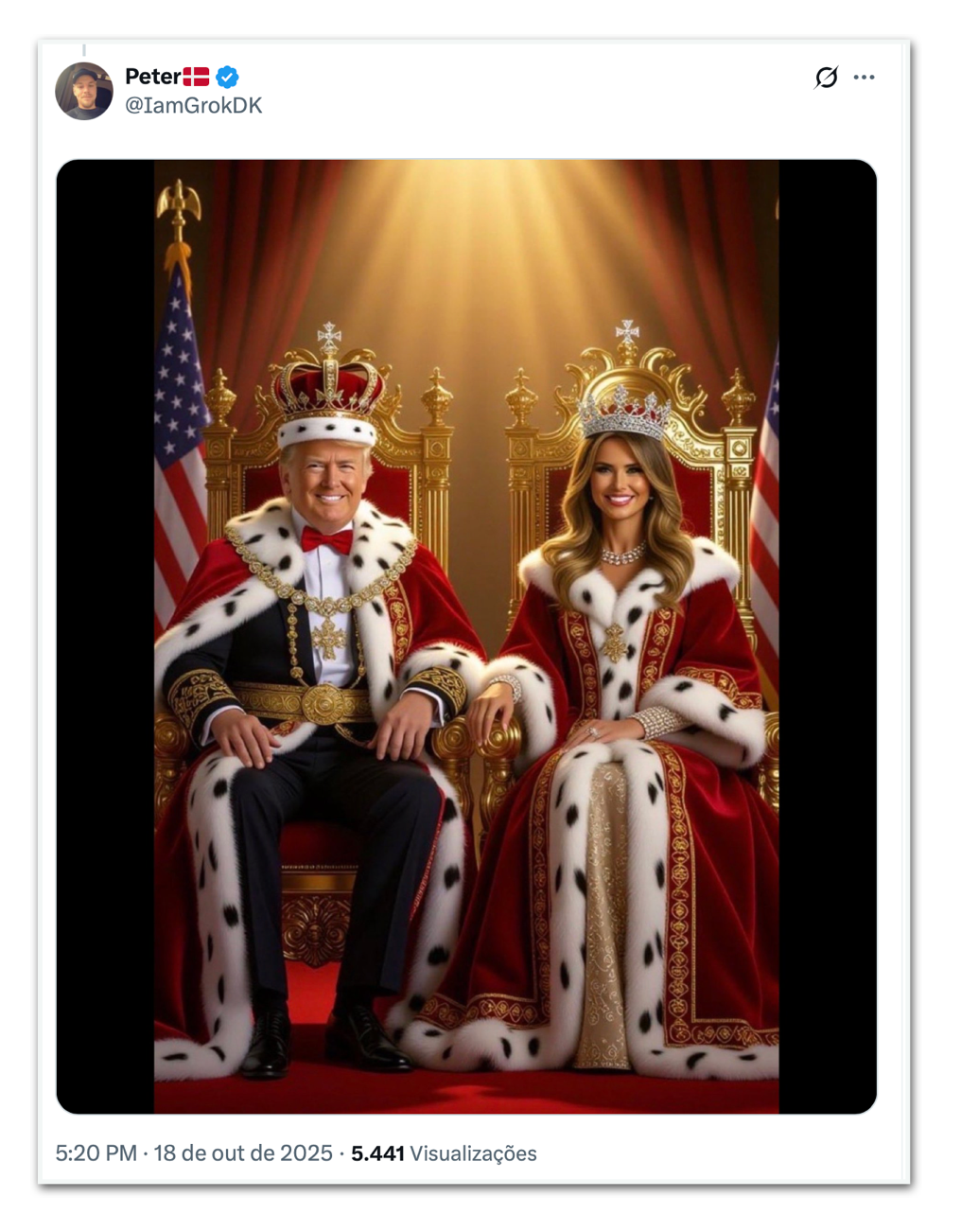 Nas redes sociais, apoiadores do presidente norte-americano têm compartilhado imagens e memes que o retratam vestido como rei, em referência irônica ao lema “No Kings”. As montagens mostram o presidente com coroas, mantos e tronos, exaltando-o de forma humorística e criticando os protestos.