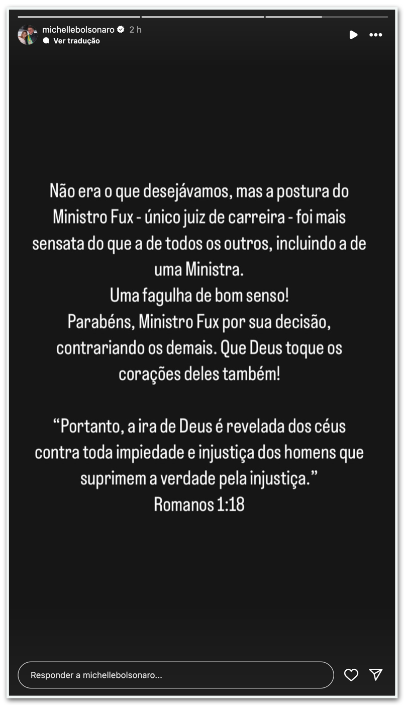 “Não era o que desejávamos, mas a postura do Ministro Fux –único juiz de carreira– foi mais sensata do que a de todos os outros, incluindo a de uma Ministra. Uma fagulha de bom senso! Parabéns, Ministro Fux por sua decisão, contrariando os demais. Que Deus toque os corações deles também”, escreveu a ex-primeira-dama no Instagram.