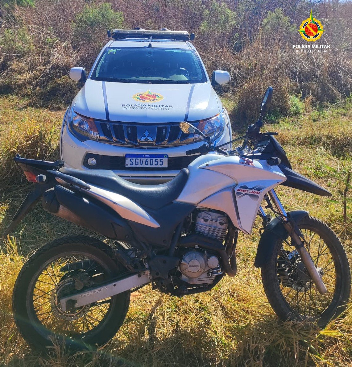 Uma motocicleta furtada foi recuperada pelos policiais militares do 8º Batalhão na manhã segunda-feira (29). O veículo foi encontrado em um local conhecido como desova de automóveis no Setor de Chácaras do P Sul em Ceilândia.