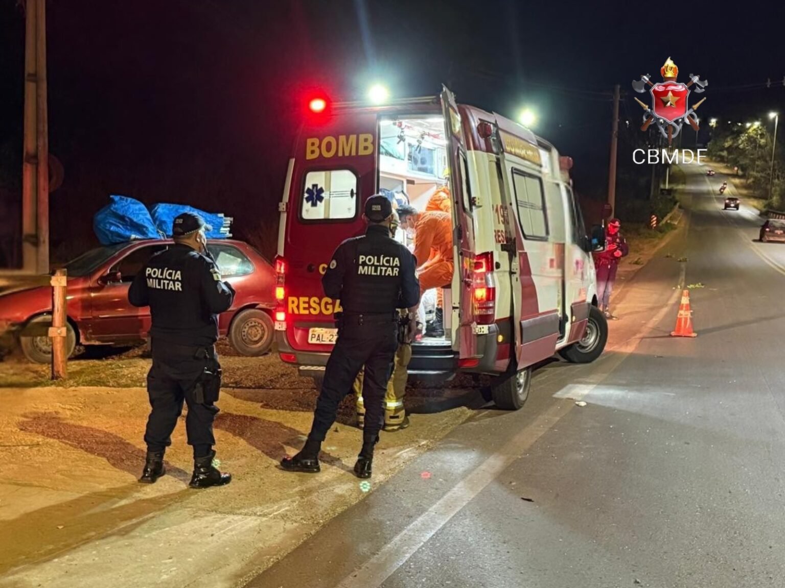 O Corpo de Bombeiros Militar do Distrito Federal (CBMDF) foi acionado às 19h50 e empregou duas viaturas no atendimento. Os socorristas prestaram os primeiros cuidados ao motociclista, que apresentava ferimentos graves, e realizaram o transporte imediato para uma unidade de saúde da região.