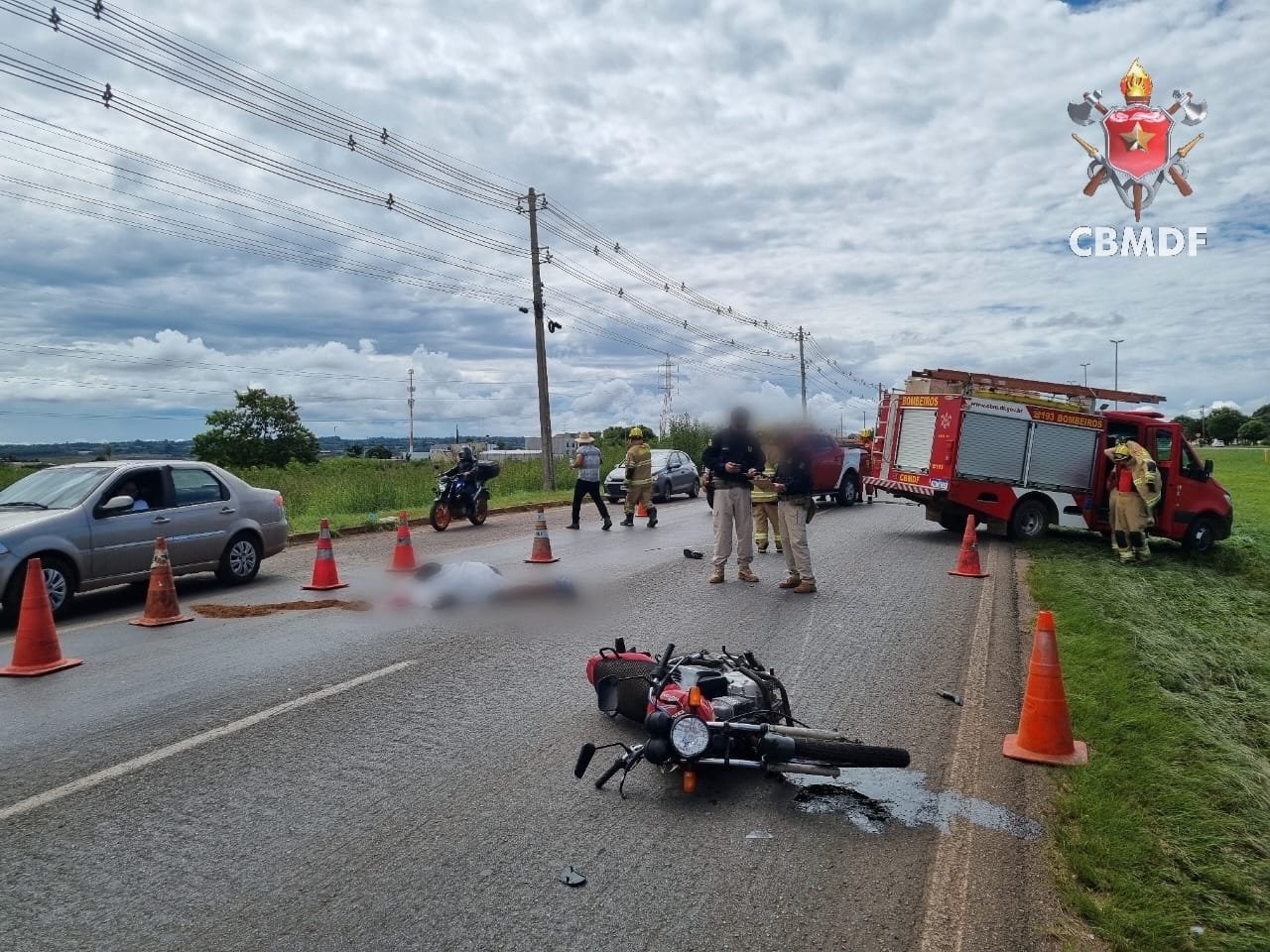 O Corpo de Bombeiros Militar do Distrito Federal (CBMDF) deslocou três viaturas para atender à ocorrência.No local do acidente, as equipes de resgate encontraram uma motocicleta Honda CG Fan vermelha, um automóvel Fiat Mobi branco e um ônibus de transporte público envolvidos na colisão.