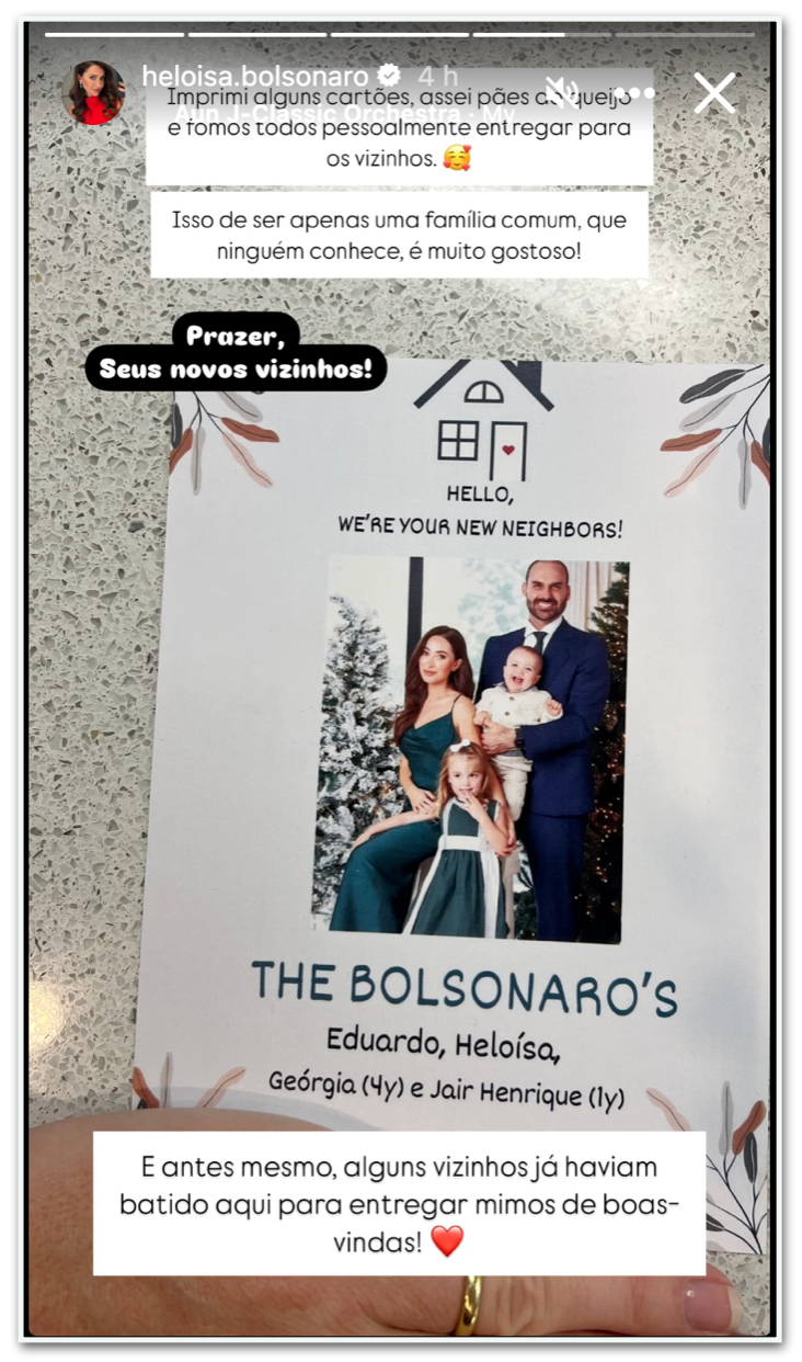 Intitulado “The Bolsonaro’s”, o cartão apresenta uma foto do casal junto aos seus 2 filhos: Geórgia, de 4 anos, e Jair Henrique, de 1 ano. “Olá, somos seus novos vizinhos”, diz a imagem.