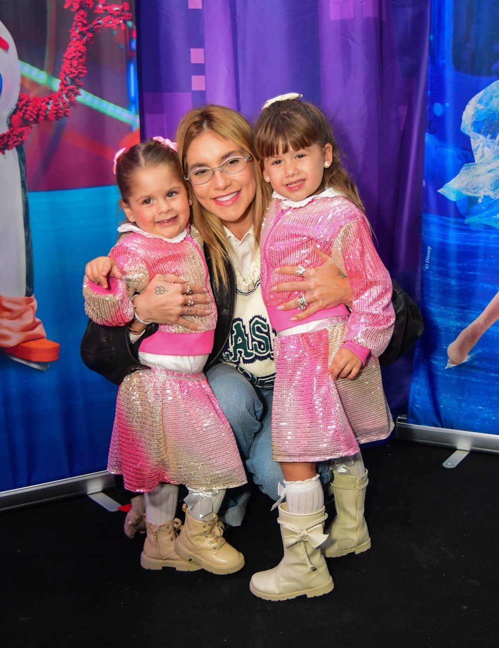 Virginia e as filhas, Maria Flor e Maria Alice, chegam para espetáculo de patinação no gelo em SPEdu Araujo/ Agnews