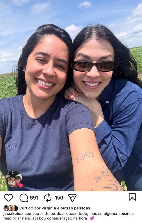 Na foto publicada, Jessika aparece ao lado de Monyque e escreveu: “Sou capaz de perdoar quase tudo, mas se alguma coisinha respingar nela, acabou a consideração na hora”.