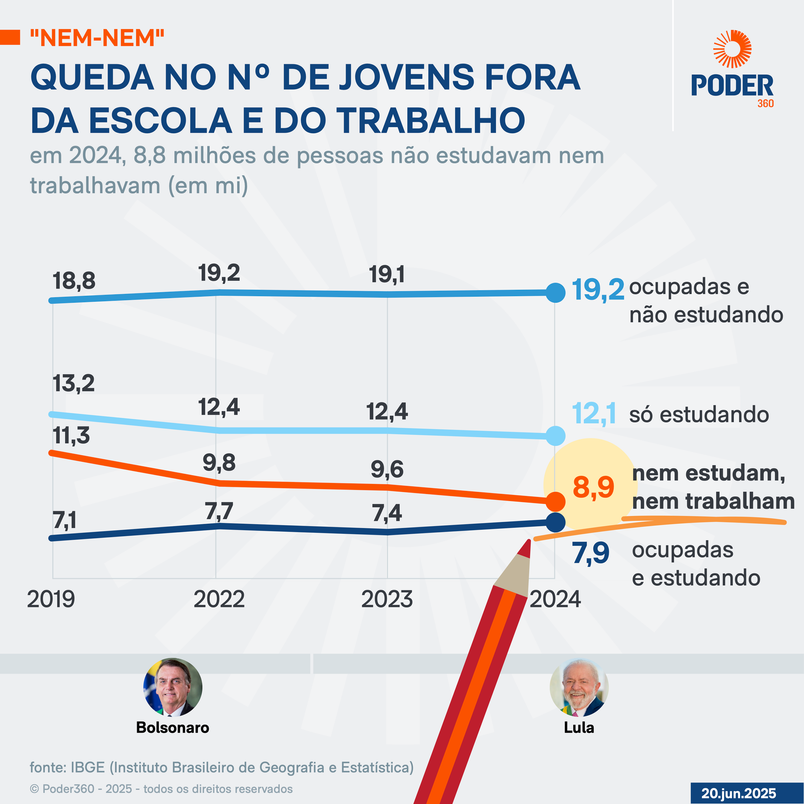 Em 2019, eram 11,3 milhões de jovens nessa situação. A queda representa uma redução de 2,5 milhões de pessoas fora do sistema educacional e do mercado de trabalho em 5 anos.