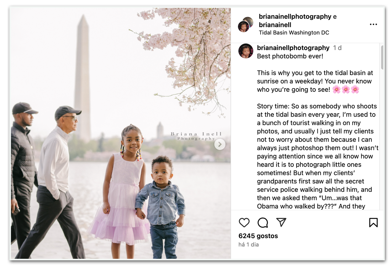 A fotógrafa responsável pela imagem, Briana Smith, compartilhou em seu perfil no Instagram o registro na 4ª feira (3.abr.2025). Na publicação, ela contou que, em um 1º momento, não havia percebido que Obama havia passado atrás das crianças justo no instante da foto.