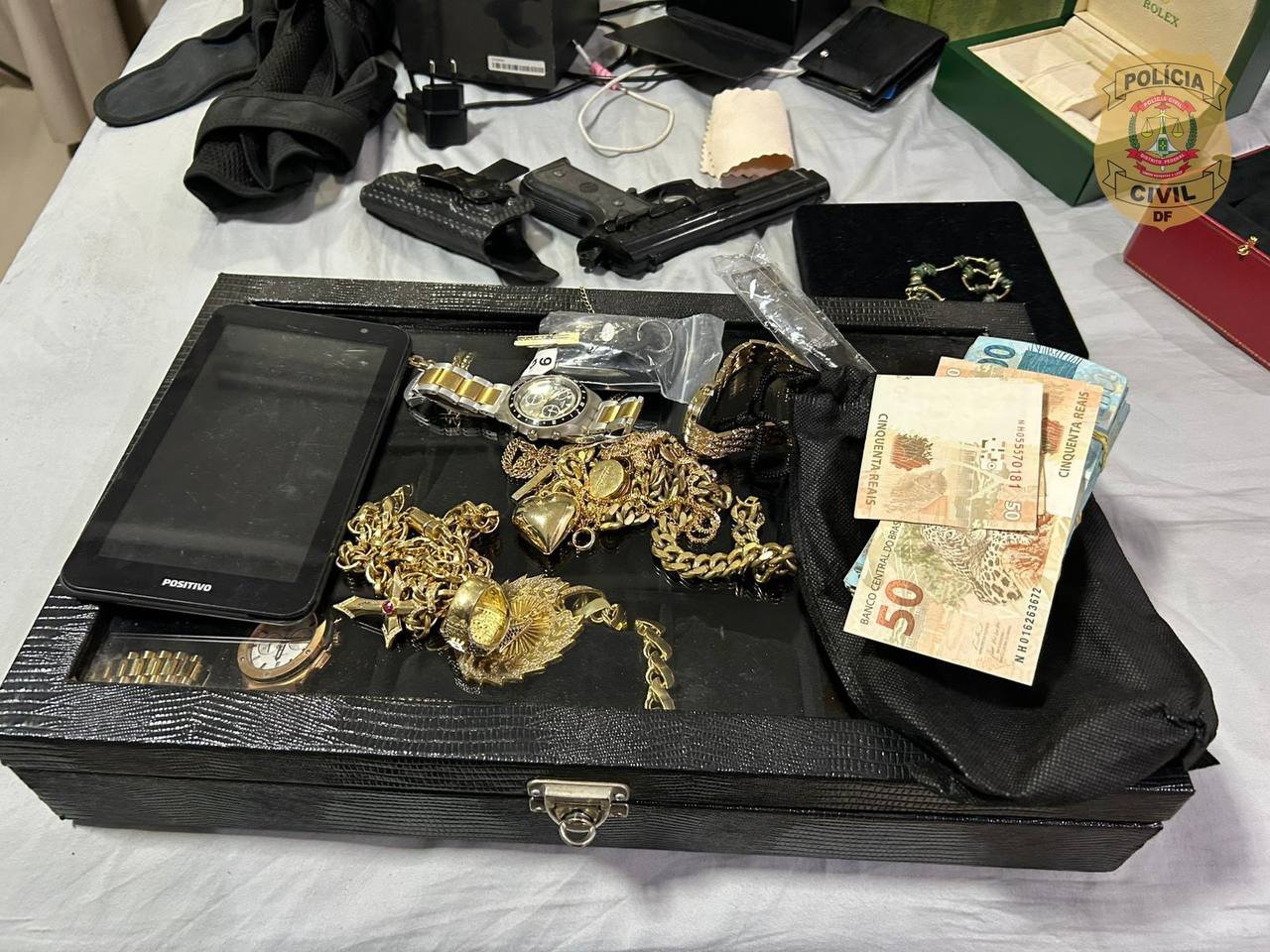 Na residência do suspeito, os policiais encontraram diversos produtos comprados em nome de terceiros, joias, R$ 39,9 mil em dinheiro, carros, relógios de luxo, munições de uso restrito, simulacros de arma e até um papagaio mantido de forma ilegal. Também foi apreendido um equipamento capaz de embaralhar sinais digitais, que pode ter sido usado para burlar a tornozeleira eletrônica que o investigado já utilizava, por conta de uma condenação anterior.