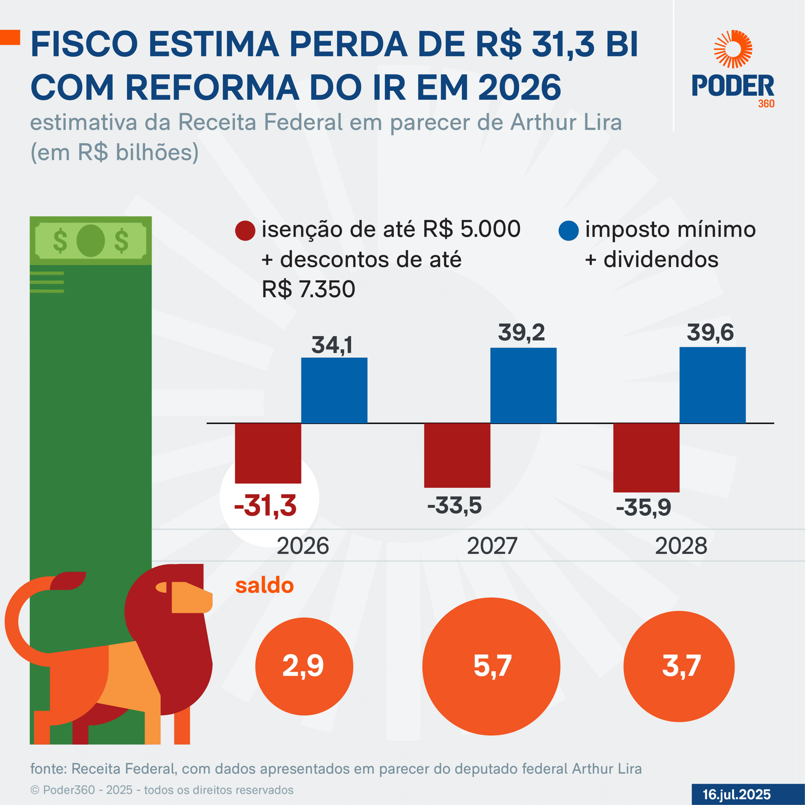 A isenção ampliada do Imposto de Renda trará um impacto negativo de R$ 31,3 bilhões em 2026, segundo os cálculos da Receita Federal apresentados no relatório do deputado Arthur Lira (PP-AL), ex-presidente da Câmara. Como menos pessoas vão pagar o tributo, o governo perde dinheiro.