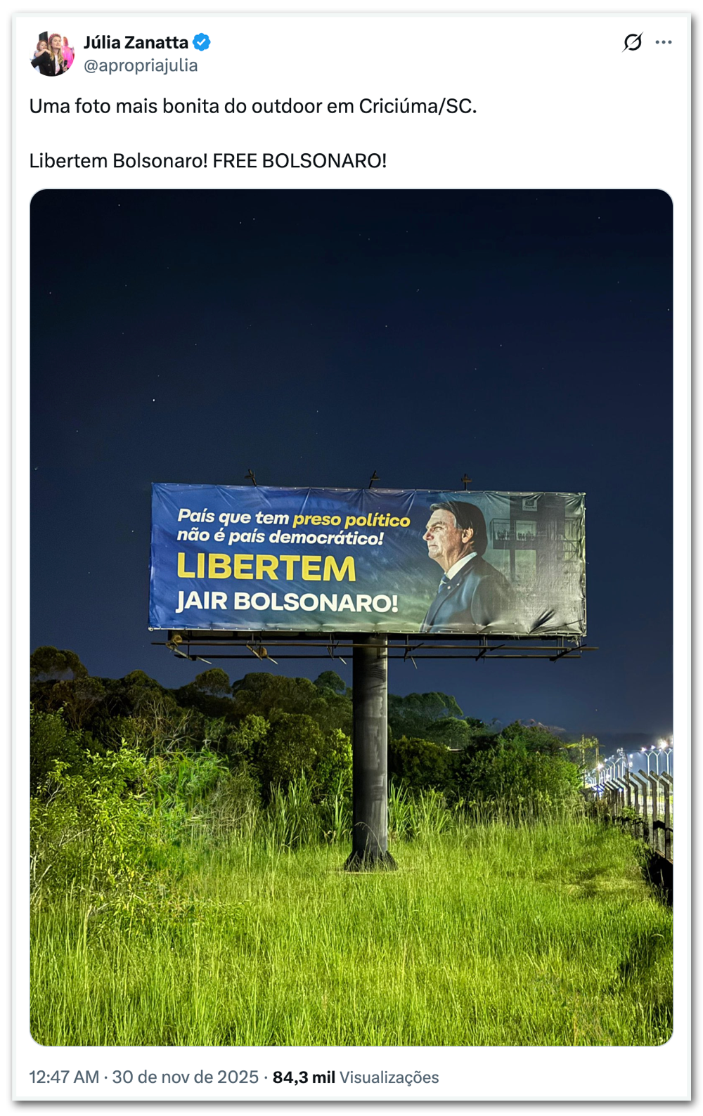 “Uma foto mais bonita do outdoor em Criciúma/SC. Libertem Bolsonaro! FREE BOLSONARO!”, escreveu Zanatta, em postagem no X neste domingo (30.nov.2025).