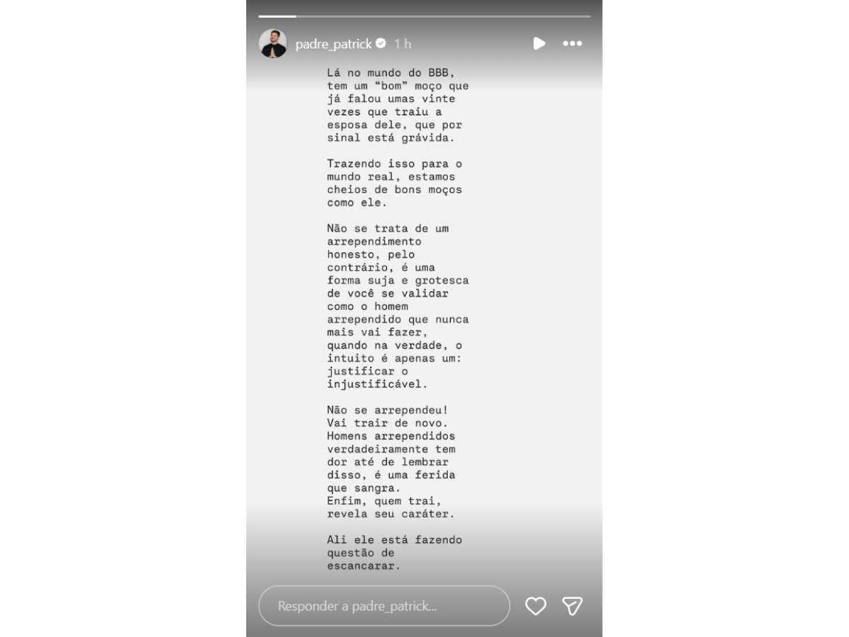 O sacerdote iniciou no Instagram: “Lá no mundo do ‘BBB’, tem um ‘bom moço’ que já falou umas vinte vezes que traiu a esposa dele, que, por sinal, está grávida. Trazendo isso para o mundo real, estamos cheios de bons moços como ele. Não se trata de um arrependimento honesto; pelo contrário, é uma forma suja e grotesca de você se validar como homem arrependido que nunca mais vai fazer, quando, na verdade, o intuito é apenas um: justificar o injustificável”.
