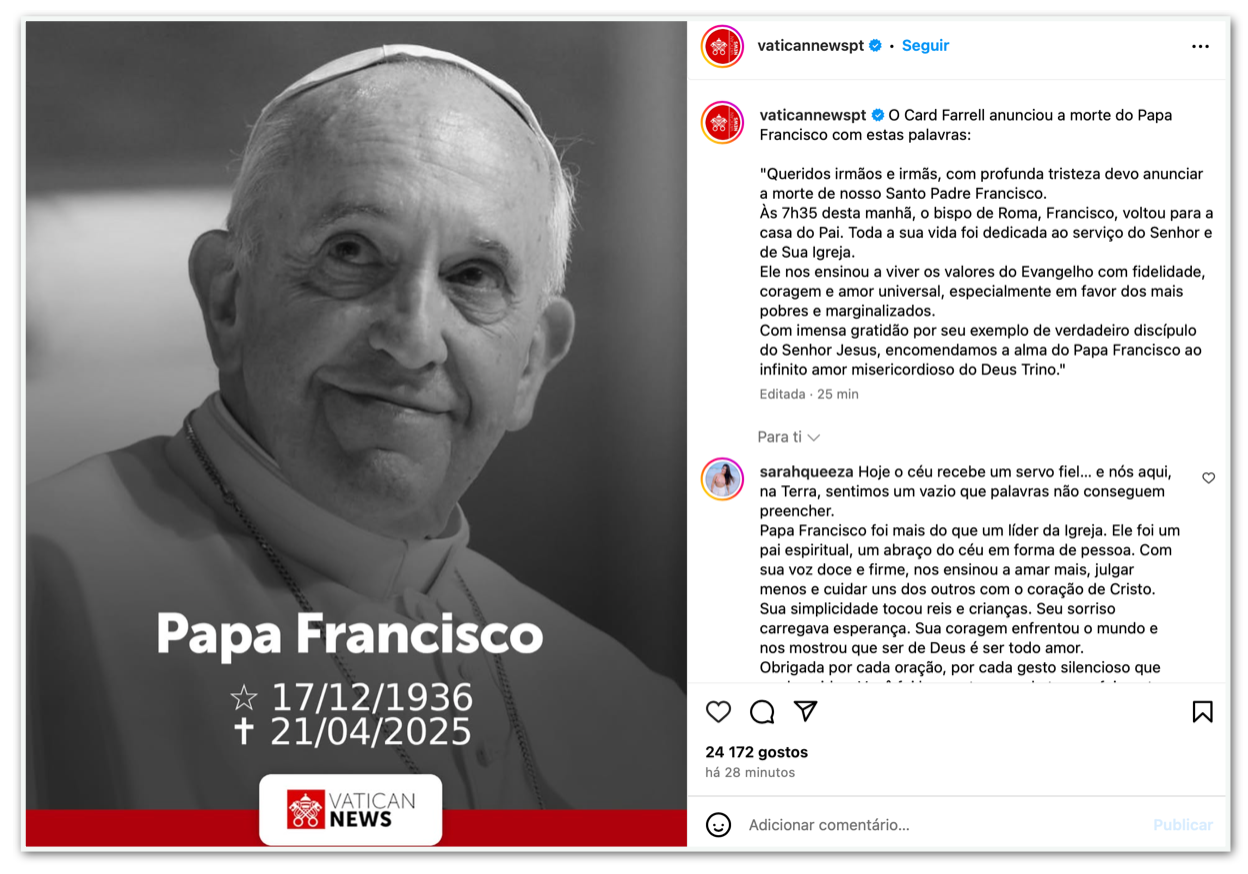 O papa Francisco morreu nesta 2ª feira (21.abr.2025), aos 88 anos. O pontífice foi o 2º líder mais velho a governar a Igreja Católica em 700 anos. Com a saúde debilitada, sofria de problemas respiratórios. Foi internado em 14 de fevereiro no hospital Policlínico Agostino Gemelli, em Roma, na Itália, para tratar uma bronquite, mas exames revelaram uma pneumonia bilateral. O religioso teve alta em 23 de março e estava em recuperação. Sua última aparição pública foi no domingo (20.abr), na benção de Páscoa.
