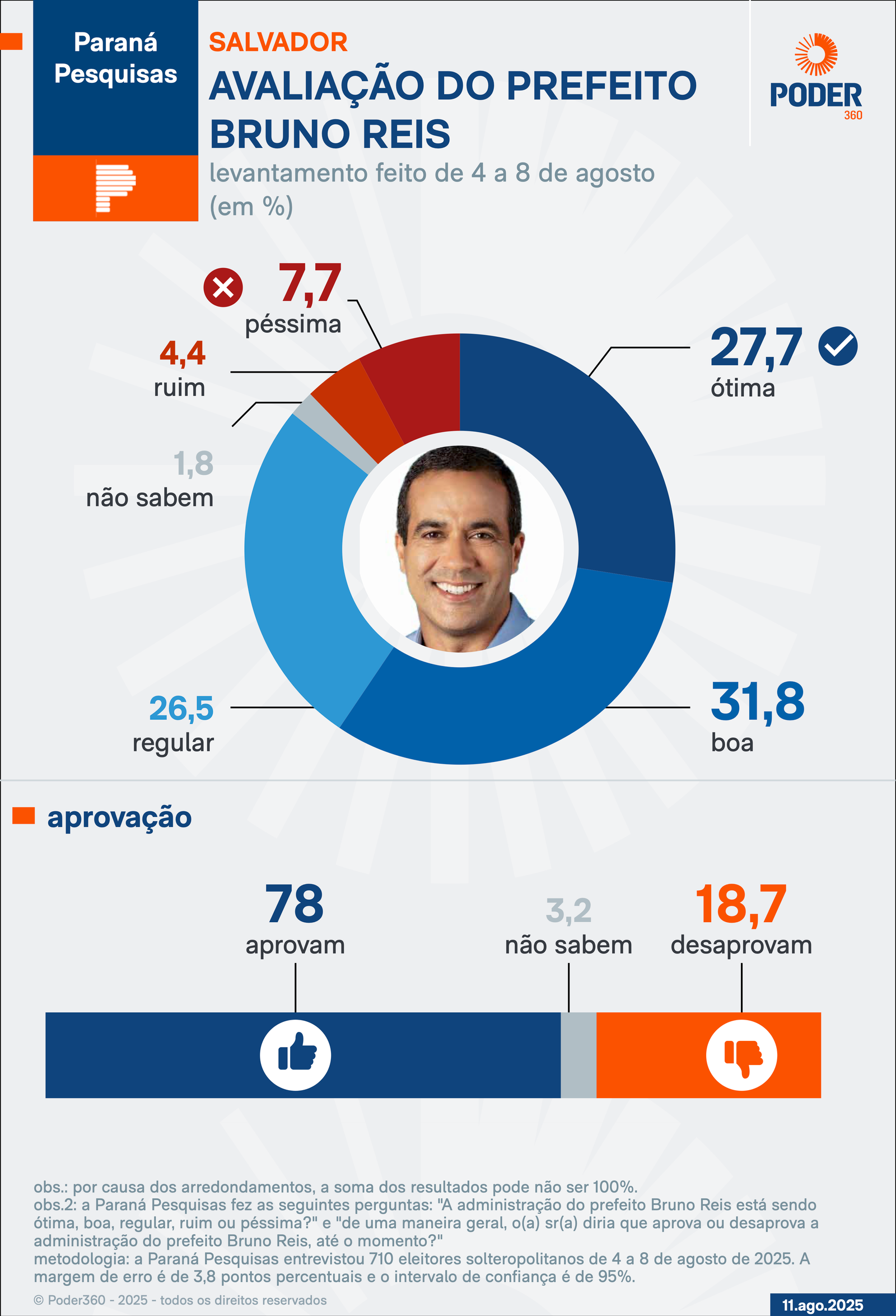 Levantamento da Paraná Pesquisas divulgado nesta 2ª feira (11.ago.2025) mostra que 78% dos eleitores de Salvador dizem aprovar a administração do prefeito Bruno Reis (União Brasil) enquanto 18,7% declaram desaprovar. Outros 3,2% não souberam opinar.