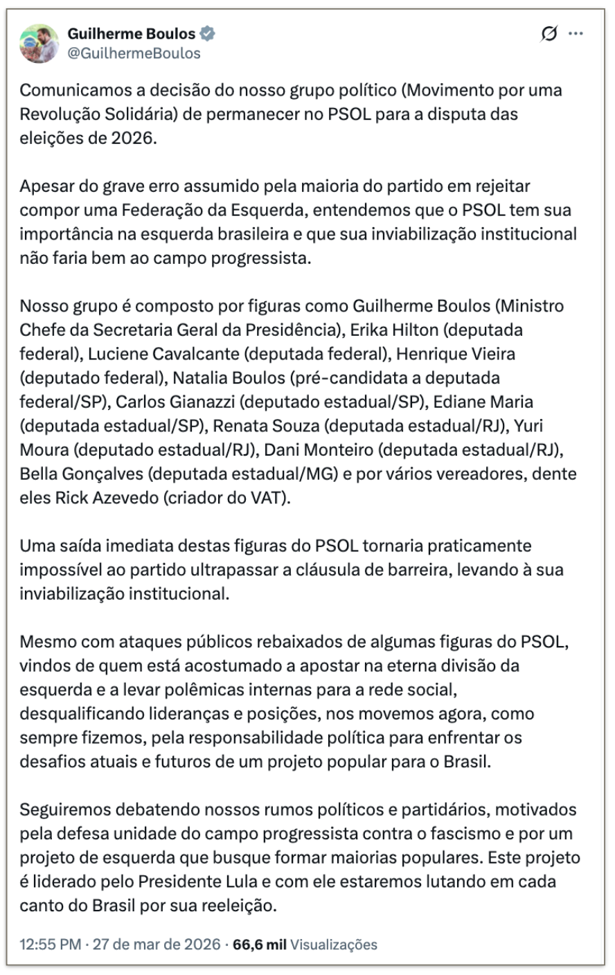 O vereador, Pedro Rousseff (PT-MG), solicitou ao Supremo Tribunal Federal (STF), nesta 6ª feira (27.mar.2026), a revogação da prisão domiciliar do ex-presidente Jair Bolsonaro (PL). O pedido foi motivado por declarações do ex-deputado Eduardo Bolsonaro (PL) durante o Conservative Political Action Conference, realizado em Dallas, no Texas. Eis a íntegra da petição (PDF – 110 kB).