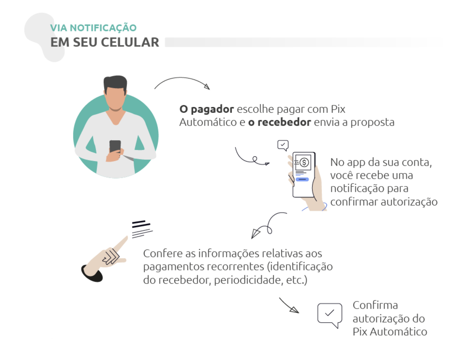 - notificação pelo celular – o recebedor envia a proposta de pagamento. O pagador recebe uma notificação no aplicativo do banco e checa os dados da cobrança (valor, periodicidade, data de débito e identificação do recebedor). Em seguida, confirma a autorização.