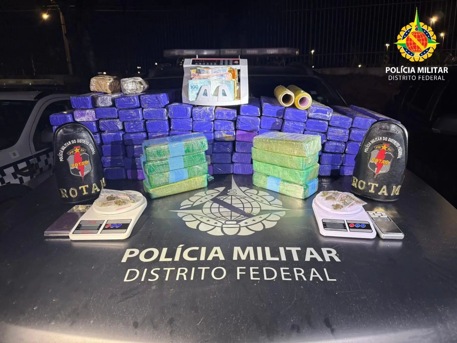 Durante a ocorrência, o segundo suspeito informou que ele realizava o armazenamento das substâncias para o elemento que teria entrado dentro da casa. Em sua residência foram apreendidos mais 61 tabletes de maconha, oito tabletes de crack, além de dinheiro em espécie e uma máquina de contar cédulas, evidenciando a organização da atividade criminosa.