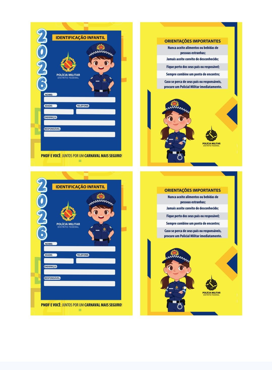 A tradicional campanha de identificação infantil da Polícia Militar do Distrito Federal (PMDF) retorna no Carnaval de 2026 como uma medida essencial para evitar desaparecimentos e garantir a segurança dos pequenos foliões.
