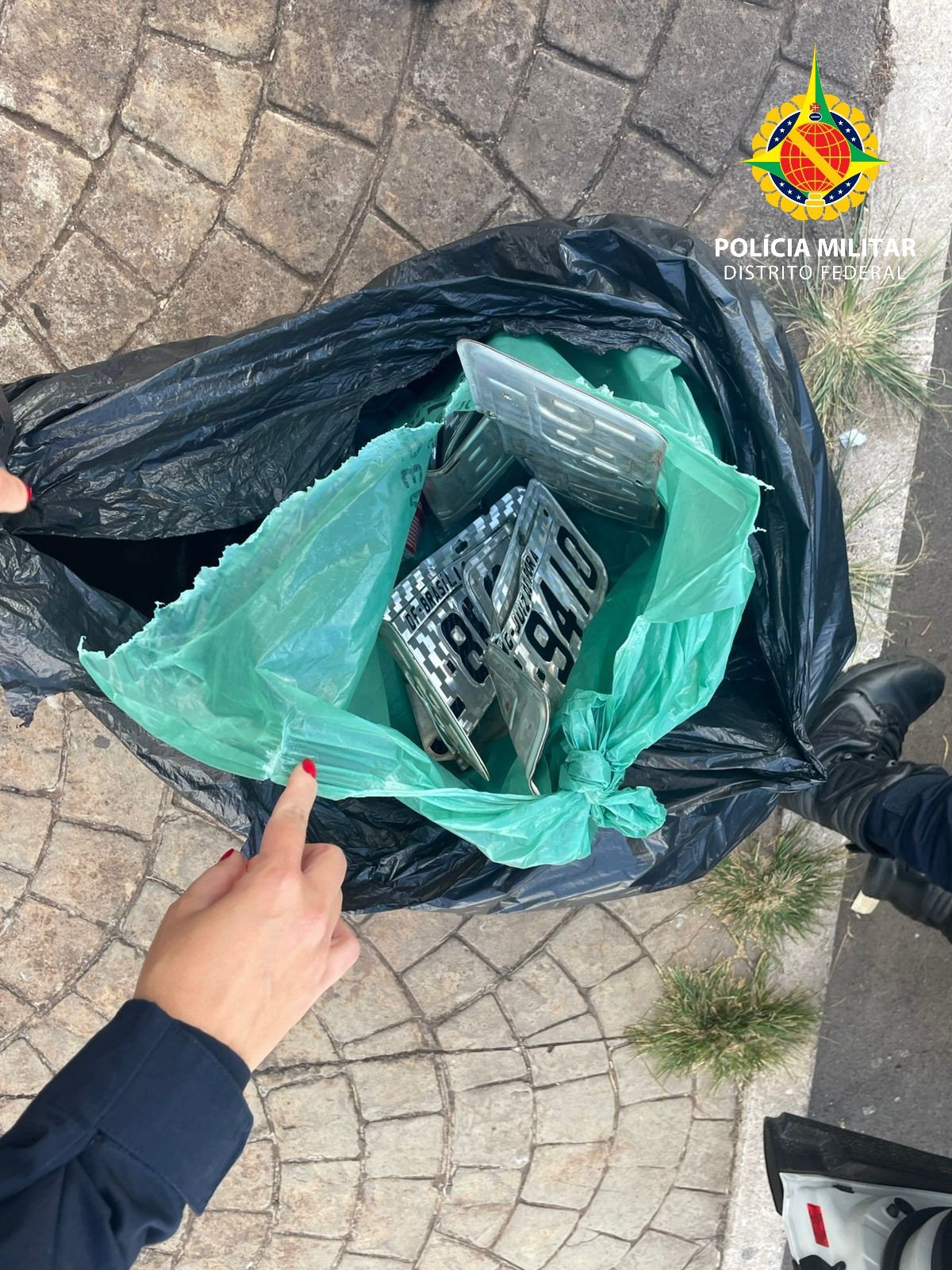 Ao chegarem no endereço, os policiais militares colheram as informações com os moradores, os quais relataram que dois indivíduos haviam subtraído placas de veículos estacionados na via Uma das vítimas (proprietária de um dos veículos alvo do furto de placas) apresentou um vídeo que registrava o momento da ação criminosa De posse das características dos suspeitos, a equipe iniciou patrulhamento nas imediações e, nas proximidades do UniCEUB, localizou um dos indivíduos com as placas furtadas