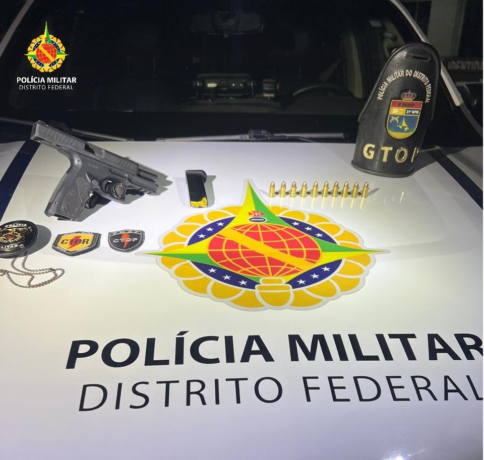 Com o apoio do serviço de Inteligência da PMDF, o homem foi localizado e abordado em uma Fiat Toro. Durante a busca veicular, foi encontrada uma pistola Taurus TS9, calibre 9mm, que estava com 10 munições intactas no carregador.